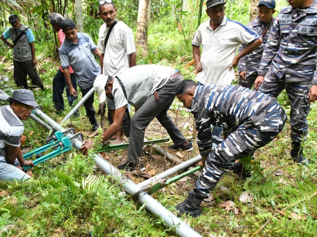 Prajurit Pangkalan Utama TNI AL VII (Lantamal VII) Kupang bersama prajurit Pangkalan TNI AL (Lanal) Maumere, serta masyarakat Desa Bungalawan dan Desa Lewo Belolon Kabupaten Flores Timur membantu pelaksanaan pemasangan pipa air tahap pertama di Desa Tapobali, Kecamatan Adonara Timur Kabupaten Flores Timur, Nusa Tenggara Timur (NTT). Senin (14/7/2025).