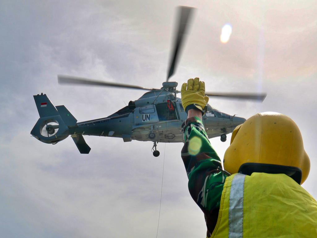 Helikopter AS 565 MBe HS-1305 dibawah binaan Skuadron Udara 100, Wing Udara 2, Puspenerbal, Juanda yang diawaki oleh Kapten Laut (P) Rangga Birawa selaku Captain Pilot dan Copilot Lettu Laut (P) Michelle, take off dari dermaga Beirut terbang menuju ke posisi KRI. Selanjutnya Heli hovering di atas geladak Heli untuk menurunkan barang dengan menggunakan hoist.