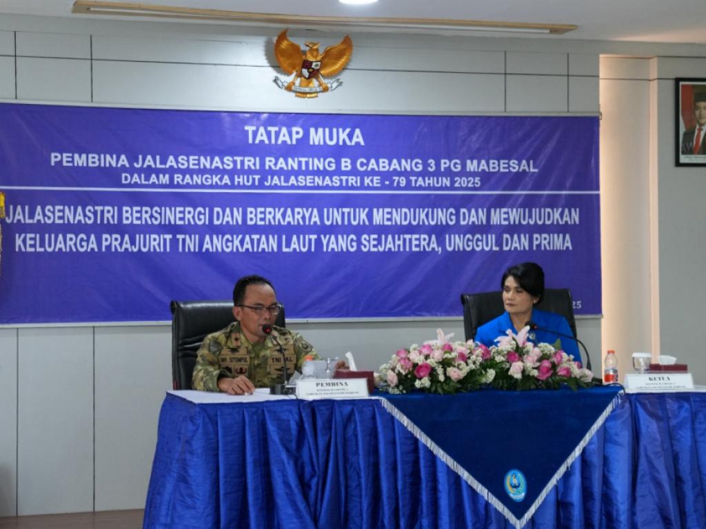Komandan Puskopaska TNI AL Laksamana Pertama TNI Monang H. Sitompul, S.A.P. sekaligus Pembina Ranting B Cabang 3 Gabungan Jalasenastri Mabesal bersama Ketua Ranting B Cabang 3 Gabungan Jalasenastri Mabesal Ny. Yuli Monang menggelar acara tatap muka kepada seluruh anggota Ranting B Cabang 3 Gabungan Jalasenastri Mabesal, bertempat di Lobby Mako Puskopaska, Jumat (11/7/2025).