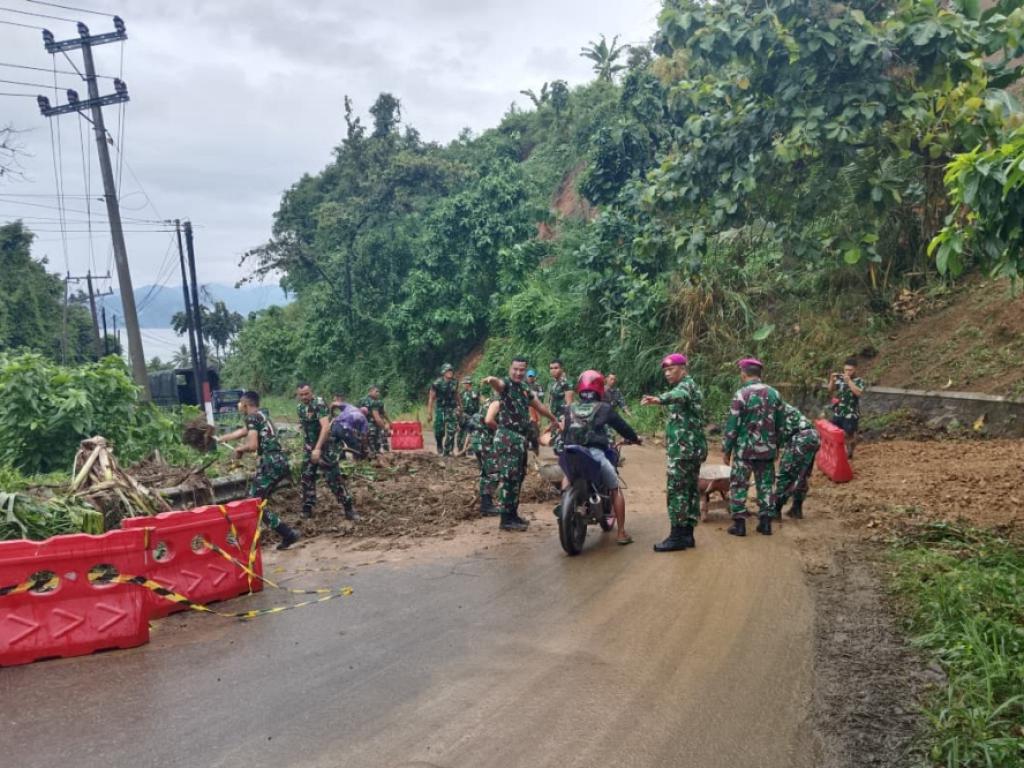 Upaya tanggap darurat bencana dan kemanusiaan kembali ditunjukkan oleh prajurit TNI AL. Kali ini, Pleton Siaga Bencana Alam Harimau Sumatera Brigade Infanteri (Brigif) 4 Marinir/BS bersama masyarakat setempat bergerak cepat menangani material tanah longsor dan pohon tumbang yang menutup jalan di Desa Ketapang dan Desa Batu Menyan, Kecamatan Teluk Pandan, Pesawaran, Lampung, Kamis (31/7).