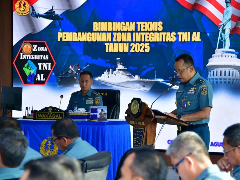 Dalam upaya mewujudkan pemerintahan yang bersih, akuntabel dan memiliki kualitas pelayanan publik yang prima, TNI AL dalam hal ini Staf Perencanaan dan Anggaran Angkatan Laut (Srenaal) menggelar Bimbingan Teknis (Bimtek) Pembangunan Zona Integritas (ZI) TNI AL Tahun 2025 yang dibuka oleh Wakil Kepala Staf Angkatan Laut (Wakasal) Laksdya TNI Erwin S. Aldedharma, bertempat di Mabesal, Cilangkap, Jakarta Timur, Senin (4/8).