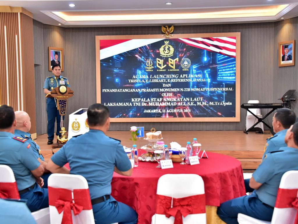 Kepala Staf Angkatan Laut (Kasal) Laksamana TNI Dr. Muhammad Ali meresmikan peluncuran Sistem Informasi dan Aplikasi Trisula, E-Library, E-Referensi, dan Depo Arsip Sejarah Angkatan Laut (Dasal), serta menandatangani prasasti peresmian Monumen Pesawat Nomad Puspenerbal pada acara yang digelar di Selasar Bawah Denma Mabesal, Cilangkap, Jakarta Timur, Senin (11/8).