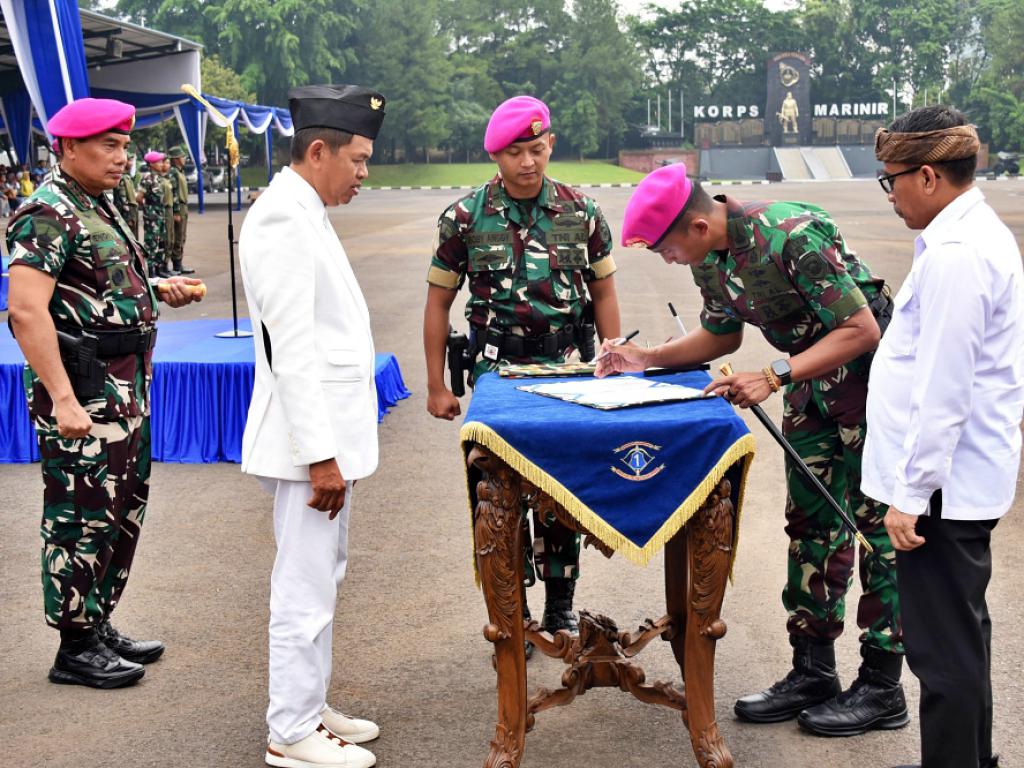 Panglima Korps Marinir Letnan Jenderal TNI (Mar) Dr. Endi Supardi, S.E., M.M., M.Tr.Opsla., CHRMP., CRMP. bersama Gubernur Jawa Barat Kang Dedi Mulyadi (KDM) menutup Pendidikan Gapura Panca Waluya Jawa Barat Istimewa bertempat di Lapangan Apel Brigif 1 Marinir, Kesatrian Marinir Hartono Cilandak, Jakarta Selatan, Senin (11/08/2025).