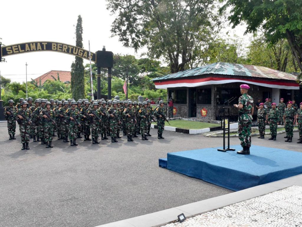Komandan Batalyon Infanteri 5 Marinir Mayor Marinir Teguh Pristiyanto Dwi S., S.E., M.Tr. Opsla. menerima dan menyambut kedatangan Taruna AAL Tingkat III Angkatan ke-72 Korps Marinir yang melaksanakan Latihan Praktek Pasukan (Lattekpas) di Batalyon Infanteri 5 Marinir Kesatrian Marinir Suroto II Ujung, Semampir, Surabaya, Jawa Timur, Jumat (22/08/2025).