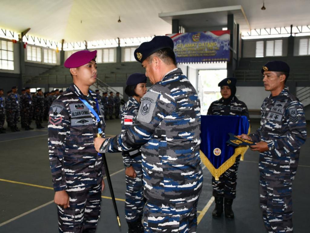 Prajurit Yonkapa 2 Mar Serda Mar Aldan Gymnastiar mengikuti program pelatihan TNI Angkatan Laut Babin Potmar TA. 2025 yang dibuka langsung oleh Komandan Pusat Teritorial Angkatan Laut (Danpusteral) Laksma TNI Albertus Agung Priyo Suseno di Gedung Oentoro Koesmardjo, Pangkalan TNI AL (Lanal) Malang. Kamis (04/09/2025).