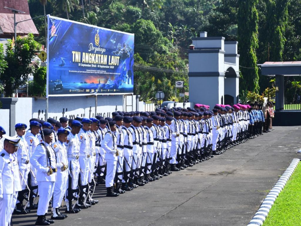 Komandan Lanudal Manado Letkol Laut (P) Akhmad Sen Sagupta beserta perwira staf dan seluruh prajurit mengikuti Upacara dan Tasyakuran dalam rangka HUT TNI AL Ke-80 Tahun 2025 di Kodaeral VIII pada Rabu (10/9/2025).