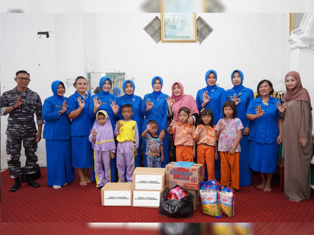Dalam kegiatan tersebut, rombongan Jalasenastri menyerahkan bantuan berupa paket sembako, perlengkapan kebutuhan sehari-hari serta santunan untuk anak-anak panti.