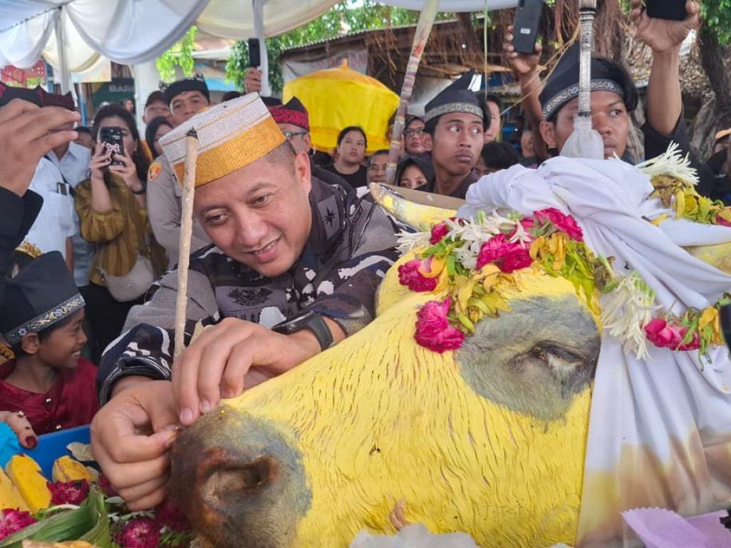 Dalam rangka mendukung pelestarian budaya maritim, Komandan Pangkalan TNI Angkatan Laut (Danlanal) Banyuwangi, Letkol Laut (P) Muhamad Puji Santoso, M.Sc., didampingi Ketua Cabang 6 Daerah Jalasenastri Kodaeral V Gabungan Jalasenastri Koarmada RI, Ny. Dilla Puji Santoso, bersama jajaran Forkopimda Banyuwangi, menghadiri kegiatan Petik Laut Nelayan Mandar yang digelar di Plengsengan Kampung Mandar, Banyuwangi, Minggu (9/11/2025).
