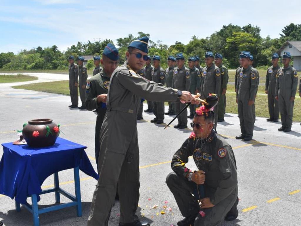 Kegiatan diakhiri dengan tradisi Fly Navy penyiraman air kembang dan pemasangan patch as Captain Pilot sebagai simbol kehormatan dan komitmen profesi penerbang. |