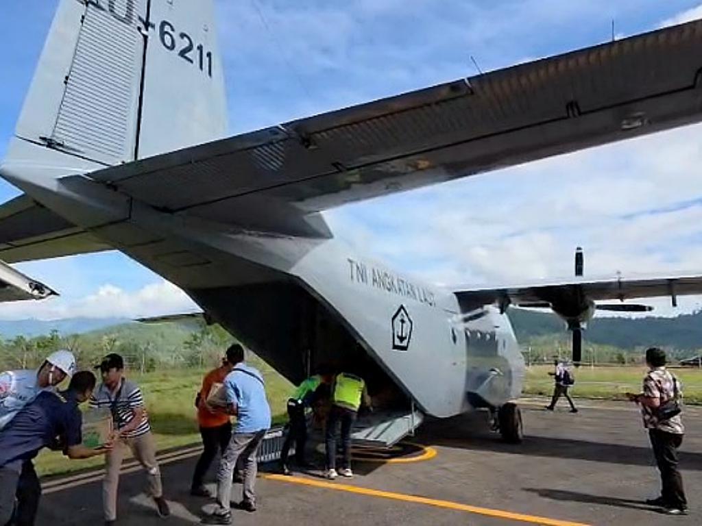 BANTUAN BAGI MASYARAKAT GAYO LUES TIBA DI BANDARA BLANGKEJEREN DIBAWA OLEH UNSUR UDARA TNI AL