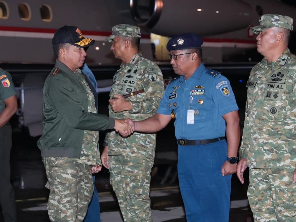 Komandan Pangkalan Udara TNI AL (Danlanudal) Juanda Kolonel Laut (P) Gugus Wahyu Setyo Utomo, S.H., M.Tr.Hanla., M.M. beserta unsur terkait melaksanakan penyambutan Kedatangan Panglima TNI Jenderal TNI Agus Subiyanto, S.E., M.Si., beserta rombongan di Base Ops TNI AL Lanudal Juanda pada Senin (12/1/2026).