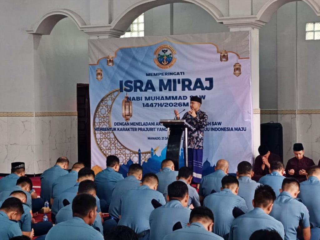 Komandan Pangkalan Udara TNI Angkatan Laut (Danlanudal) Manado, Letkol Laut (P) Akhmad Sen Sagupta, beserta seluruh prajurit Lanudal Manado menghadiri peringatan Isra Mi’raj Nabi Muhammad SAW 1447 H/2026 M yang dilaksanakan di Masjid Amirul Bahri Kodaeral VIII, Manado, Rabu (21/1/2026).