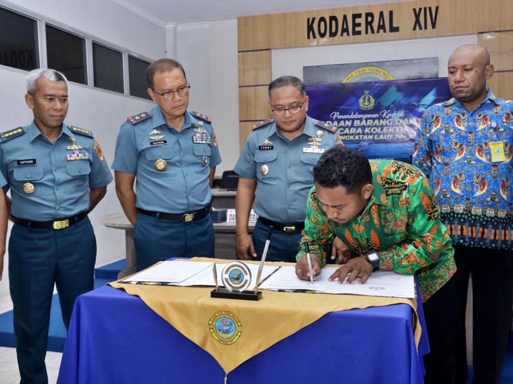 Bertempat di Ruang Vicon Mako Komando Daerah TNI Angkatan Laut XIV (Kodaeral XIV), Distrik Sorong Manoi, Kota Sorong, Papua Barat Daya, Komandan Komando Daerah TNI Angkatan Laut XIV (Komandan Kodaeral XIV) Laksamana Muda TNI Djatmoko, S.T., M.M., CHRMP, didampingi Wakil Komandan Kodaeral XIV Laksamana Pertama TNI Tomy Herlambang, serta para Pejabat Utama terkait, secara virtual mengikuti kegiatan Penandatanganan Kontrak Secara Kolektif Tahun Anggaran 2026 dengan Mitra Penyedia Barang dan Jasa, Selasa (27/01/2026).