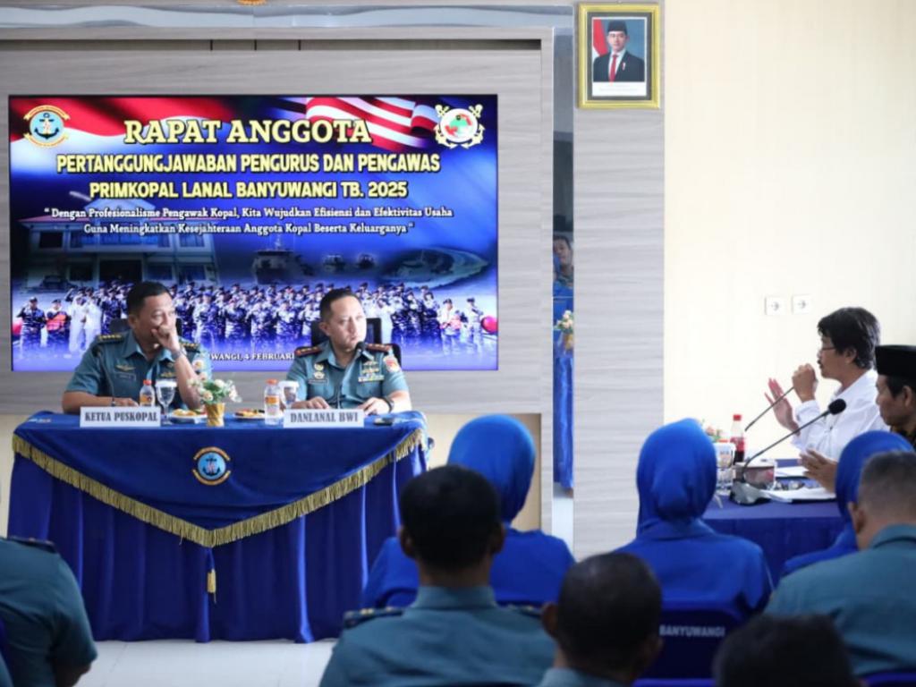 Dalam rangka mewujudkan tata kelola koperasi yang transparan dan profesional, Primer Koperasi Angkatan Laut (Primkopal) Lanal Banyuwangi menyelenggarakan Rapat Anggota dan Pertanggungjawaban (RAPJ) Pengurus dan Pengawas Tahun Buku 2025. Kegiatan yang mengusung tema “Dengan Profesionalisme Pengawak Kopal, Kita Wujudkan Efisiensi dan Efektivitas Usaha Guna Meningkatkan Kesejahteraan Anggota Kopal Beserta Keluarganya” ini berlangsung di Aula Wisma Bahari Mako Lanal Banyuwangi, Ketapang, Banyuwangi, Rabu (4/2/2026), sebagai momentum evaluasi kinerja sekaligus penguatan komitmen dalam meningkatkan kesejahteraan anggota beserta keluarganya.