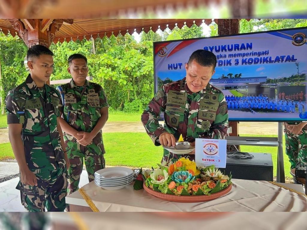 Sebagai wujud rasa syukur, Prajurit Satuan Pendidikan 3 Kodiklatal, melaksanakan tasyakuran Hari Ulang Tahun (HUT) ke-3 Satdik 3 Kodiklatal, yang dipimpin langsung Komandan Satdik 3 Kodiklatal Kolonel Marinir Darwin Tambunan, S.M., bertempat di Joglo Kawah Chandradimuka Jalasena Satdik 3 Kodiklatal Sorong, Katapop, Papua Barat Daya, Rabu (18/2/2026).