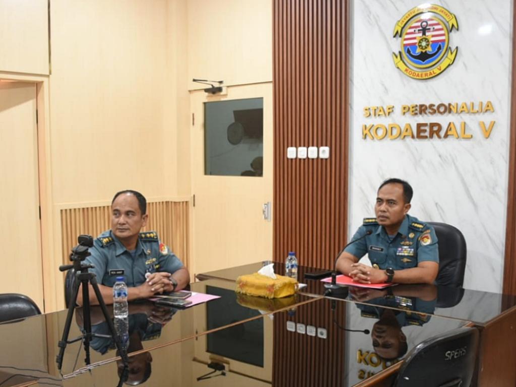 Komandan Komando Daerah TNI AL (Dankodaeral) V Laksda TNI Ali Triswanto, S.E., M.Si., diwakili Apers Dankodaeral V Kolonel Laut (P) Rahadian Rahmadi, S.E., M.Tr.Hanla., M.am., dan Kadisminpers Kodaeral V Letkol Laut (P) Moh. Hanif, A.Md., M.Tr.Opsla., mengikuti Video Conference (Vicon) Sidang Wawancara Kenaikan Pangkat (Wankarbidkat) B Usulan Kenaikan Pangkat (UKP) ke pangkat Letnan Kolonel (Letkol) dan Mayor, yang dilaksanakan pada 1 April 2026 di Rupat Spers Mako Kodaeral V, Perak, Surabaya. Rabu (18/02/2026)