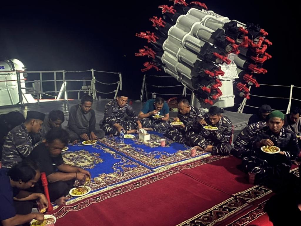 Suasana hangat dan penuh kebersamaan terasa di geladak KRI Tjiptadi-381 saat prajurit TNI Angkatan Laut menggelar kegiatan buka puasa bersama para nelayan di wilayah perairan daerah operasi, Laut Jawa Minggu (1/3/2026).