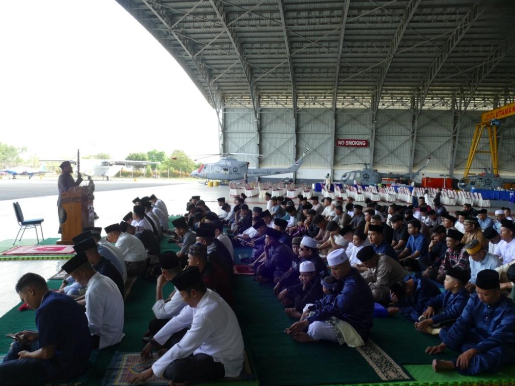 Keluarga besar Penerbangan TNI AL Wilayah Tanjungpinang bersama masyarakat sekitar melaksanakan Shalat Idul Fitri 1447 H secara bersama-sama di Hanggar Lanudal Tanjungpinang. Sabtu (21/03).