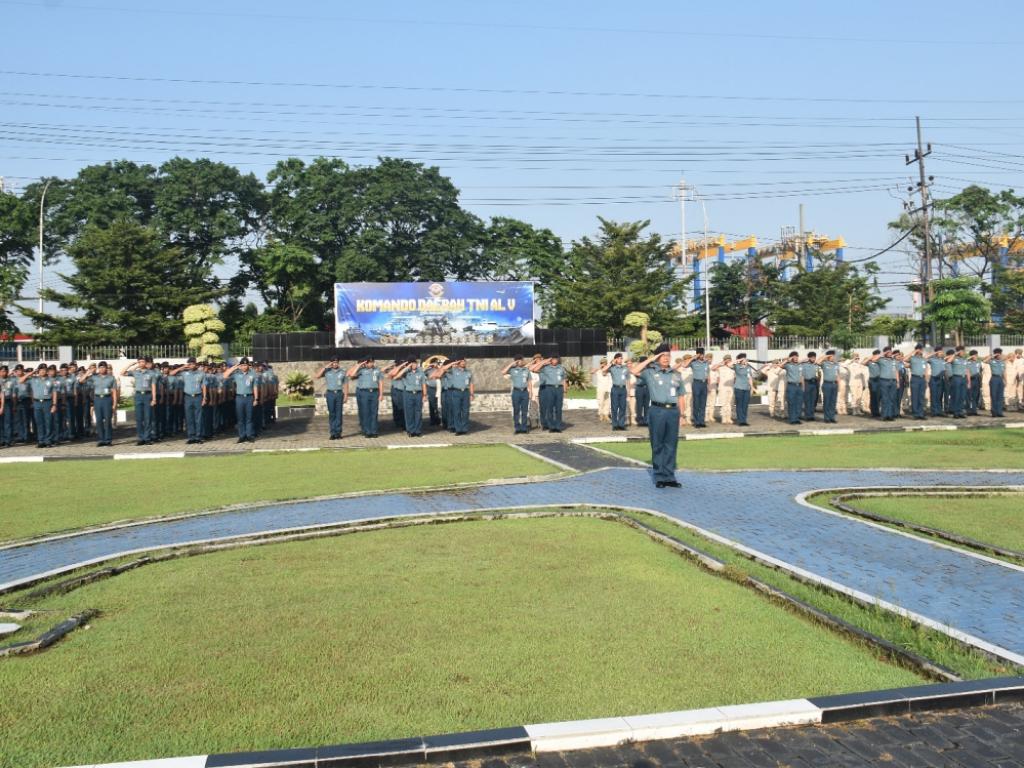 Komando Daerah TNI Angkatan Laut (Kodaeral) V melaksanakan kegiatan apel gabungan yang dipimpin oleh Kadispen Kodaeral V Letkol Laut (P) Arif Priwadi Wibowo, M.Tr.Opsla., di Lapangan Mako Kodaeral V, Surabaya, Senin (30/3/2026).