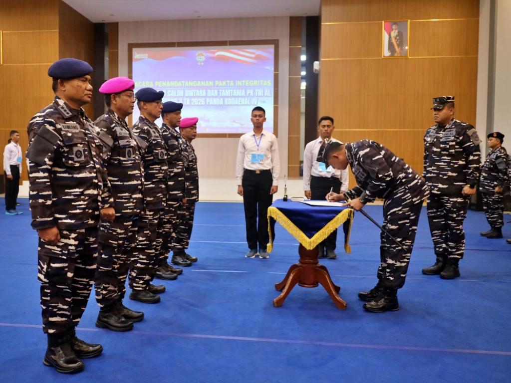 Guna komitmen seleksi bersih, adil dan transparan, Komando Daerah Angkatan Laut (Kodaeral) IV melaksanakan kegiatan penandatanganan Pakta Integritas Caba Pria & Cata PK TNI AL Gelombang II Tahun Anggaran 2026 yang digelar di Gedung Raja Haji Fisabilillah, Mako Kodaeral IV, Selasa (07/04/26).