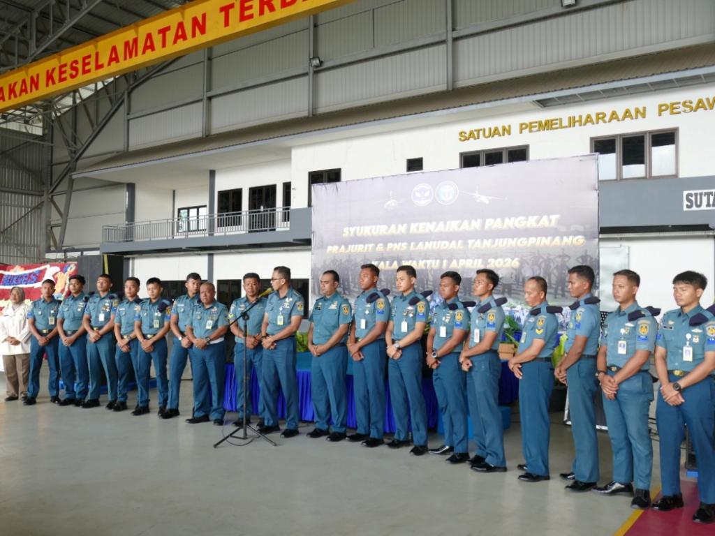 Suasana hangat dan penuh kekeluargaan mewarnai acara syukuran kenaikan pangkat 21 prajurit dan PNS Lanudal Tanjungpinang kala waktu 1 April 2026 yang digelar di Hanggar Lanudal Tanjungpinang, Kamis (09/04/2026).