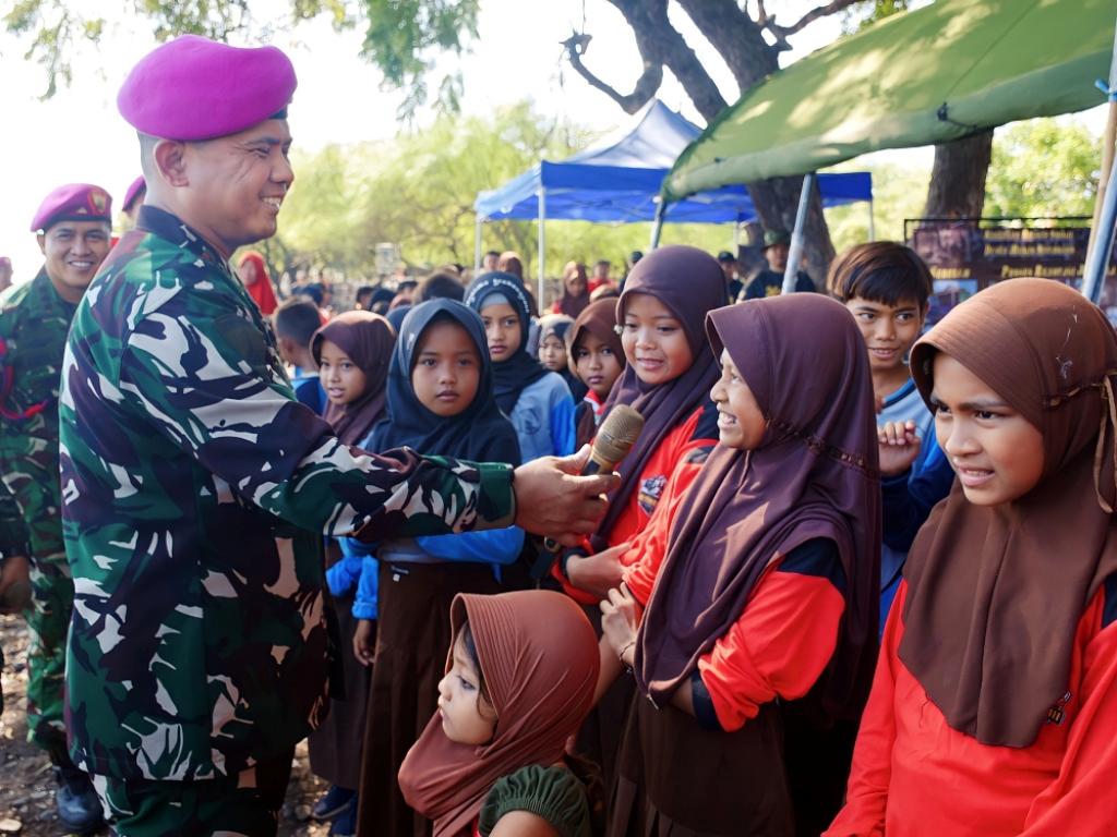 Selesai meninjau latihan Prajuritnya, Komandan Pasmar 2 beserta Para Asistennya menyapa warga Kampung Labuhan Merak di daerah Baluran. Keramahan Komandan Pasmar 2 Mayjen TNI (Mar) Dr. Oni Junianto menyapa anak-anak pada saat pelaksanaan bersih-bersih pantai di Labuhan Merak, Desa Sumberwaru, Kecamatan Banyuputih, Kabupaten Situbondo Jawa Timur, Jumat (10/04/2026).